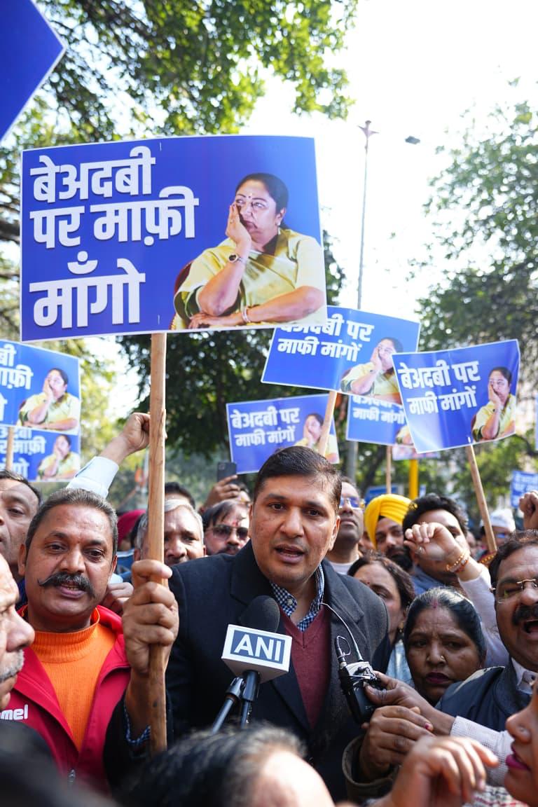 اس دوران آپ نے سکھ گرو ¶ں کی توہین کرنے والے بی جے پی کے وزراءاور رہنما ¶ں سے عوامی معافی کا مطالبہ کرتے ہوئے شدید نعرے بازی کی۔ جب آپ کے کارکن بی جے پی ہیڈکوارٹر پہنچنے والے تھے تو دہلی پولیس نے بیریکیڈ لگا کر انہیں آگے بڑھنے سے روک دیا اور ایک ایک کرکے سب کو حراست میں لے لیا۔ سوربھ بھاردواج سمیت کئی رہنما ¶ں کو پولیس آئی پی اسٹیٹ تھانے لے گئی، جہاں انہوں نے دھرنا دیا اور بی جے پی کے خلاف زبردست نعرے بازی کی۔
