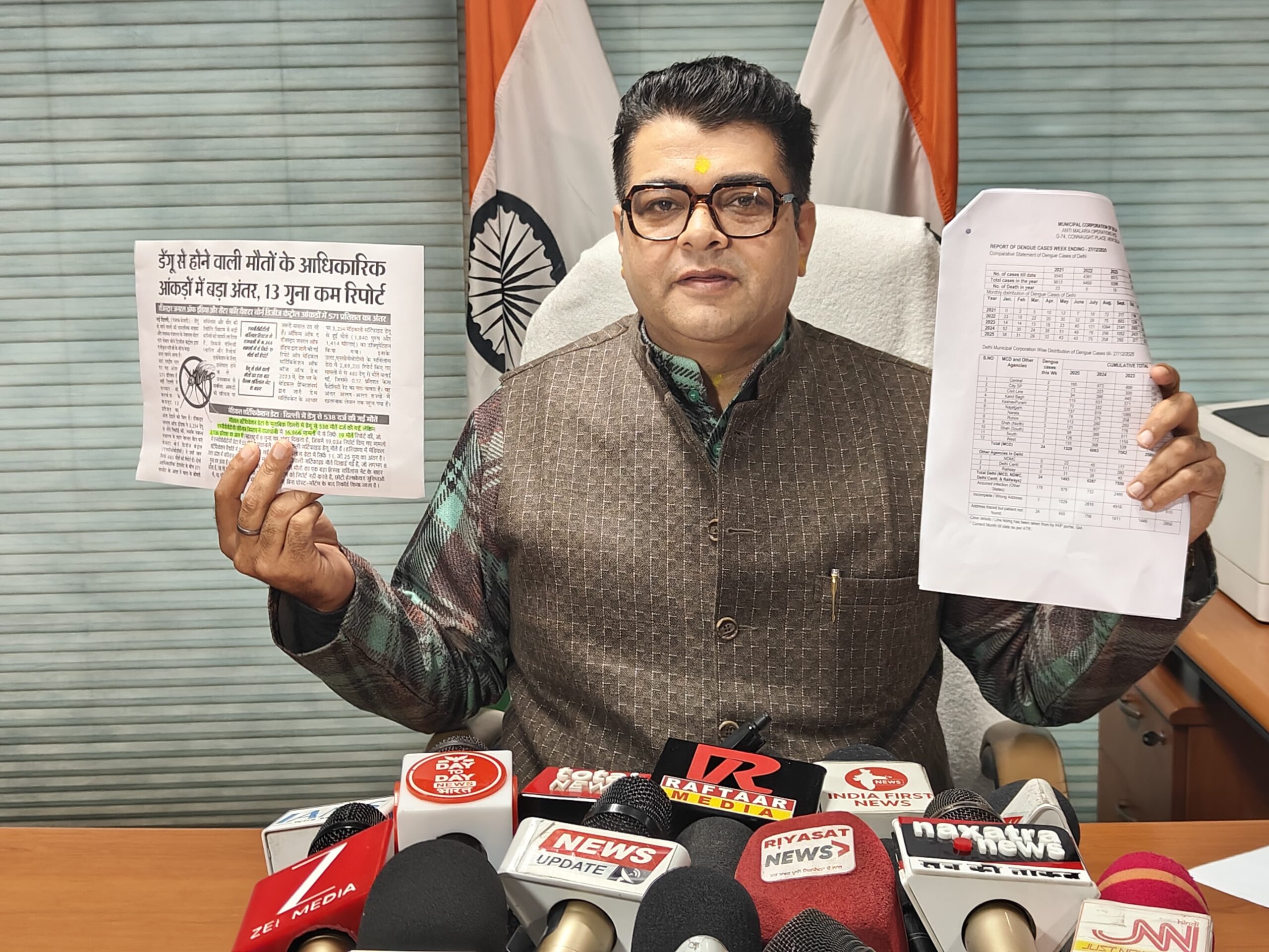 انکش نارنگ نے کہا کہ رجسٹرار جنرل آف انڈیا اور وزارت صحت کے قومی مرکز برائے ویکٹر بورن ڈیزیز کنٹرول کے اعداد و شمار کے درمیان 571 فیصد فرق ہے۔ رجسٹرار جنرل آف انڈیا کے مطابق ملک میں ڈینگی کی وجہ سے 3,254 اموات ہوئی ہیں جن میں 1,840 مرد اور 1,414 خواتین شامل ہیں جبکہ وزارت صحت کا محکمہ صرف 485 اموات بتا رہا ہے۔ انہوں نے کہا کہ بی جے پی کی سرکاروالی ایم سی ڈی اس رپورٹ کو باقاعدگی سے جاری نہیں کر رہی ہے، دو ماہ سے اسے جاری نہیں کیا ہے۔