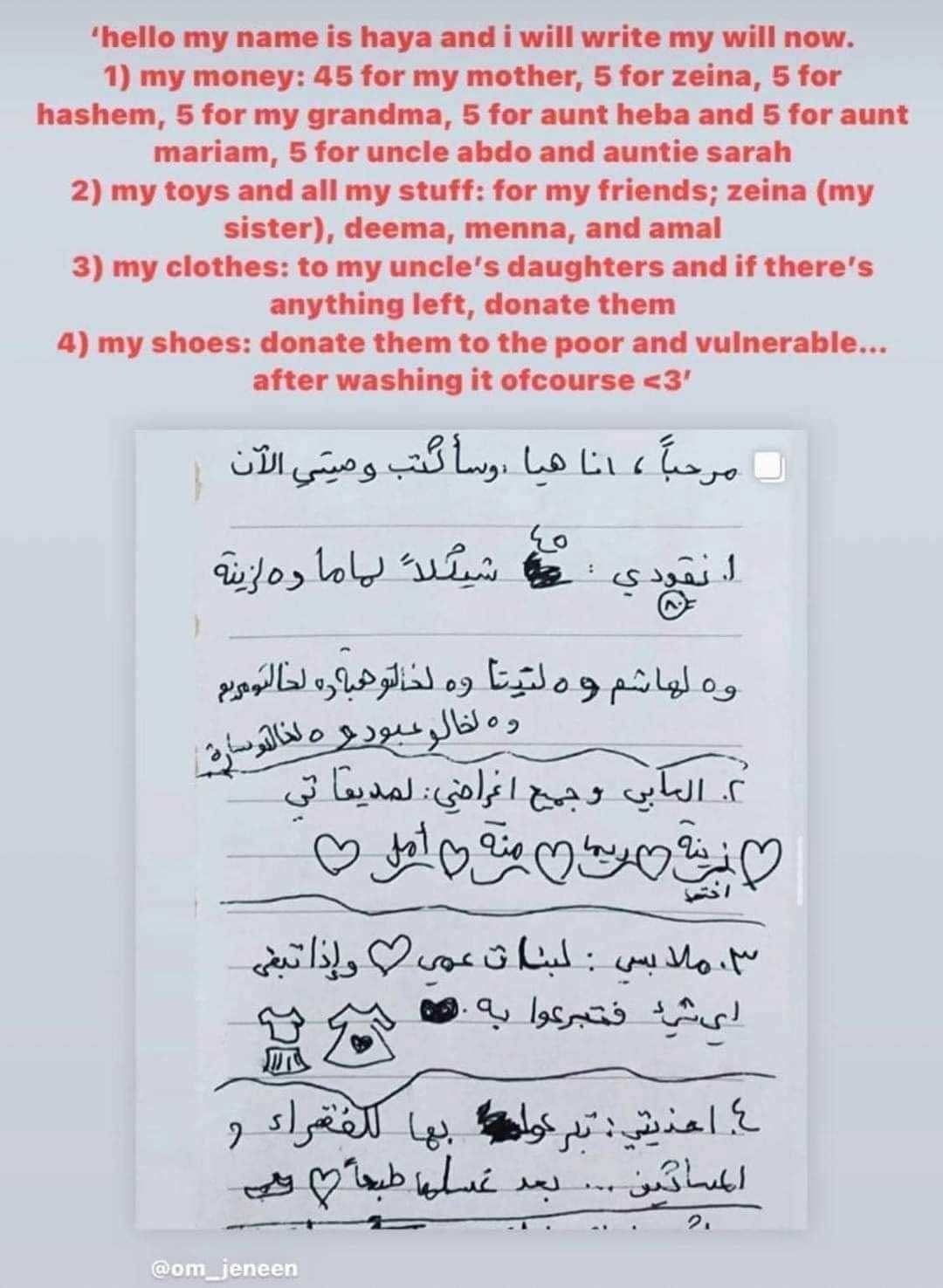 اس حملے میں کئی بچے بھی شہید ہوئے جن میں ایک بچی حیا بھی شامل تھی، حیا کی دلخراش وصیت سوشل میڈیا پر وائرل ہوگئی۔شہید فلسطینی بچی نے سادےکاغذ پر لکھا کہ میری پاکٹ منی سے 45 شیکل میری ماں کو دیے جائیں، 5 شیکل میرے بھائی ہاشم اور 5 بہن ذینہ کو دیے جائیں، 5 شیکل دادی اور 5 پھوپھی کو دیے جائیں۔واضح رہے کہ غزہ کے محصور اور مظلوم فلسطینیوں کو بدستور اسرائیلی جنگی جرائم کا سامنا ہے، اسرائیلی فوج نے غزہ کے اسپتال کے بعد قدیم ترین آرتھوڈوکس چرچ پر بھی فضائی حملہ کیا ہے جس میں پناہ لینے والے 10 فلسطینی شہید ہوگئے ہیں۔
