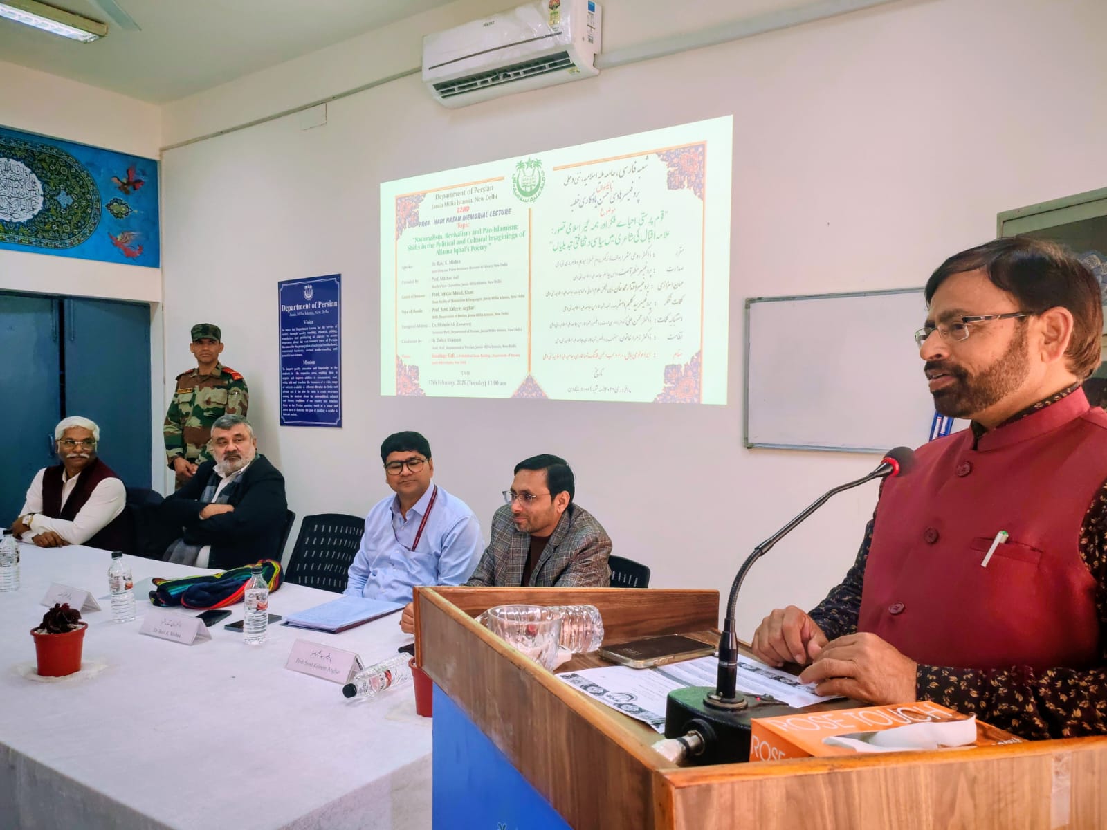 شعبہ فارسی جامعہ ملیہ اسلامیہ کے ایرانولوجی ہال میں منگل کو ’قوم پرستی، احیائے فکر اور ہمہ گیر اسلامی تصور: علامہ اقبال کی شاعری میں سیاسی و ثقافتی تبدیلیاں‘کے عنوان سے بائیسواں پروفیسرہادی حسن یادگاری خطبہ کا انعقاد عمل میں آیا۔ اس اجلاس کا افتتاح ڈاکٹر یاسر عباس نے تلاوت کلام پاک سے کیا ۔ اس کے بعد گلدستوں سے مہانوں کا استقبال کیا گیا۔آج کے مقرر خاص ڈاکٹر روی کانت مشرا ،جوا مئنٹ ڈائرکٹر، وزیر اعظم میوزیم ولائبریری نئی دہلی تھے ۔ صدارت وائس چانسلر پروفیسر مظہر آصف اور مہمان اعزازی کی حیثیت سے پروفیسر اقتدار محمد خان ڈین فیکلٹی آف ہیومنٹیز اینڈ لیونگیجز نے شرکت فرمائی۔