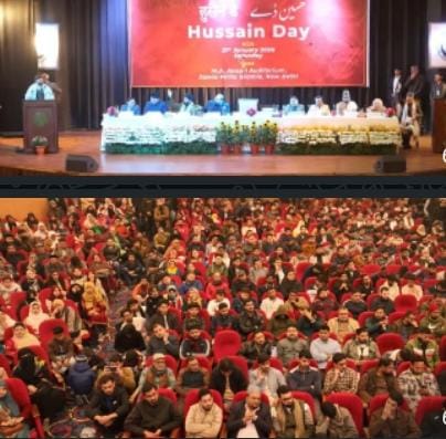 حسین ڈے ایسوسی ایشن، جامعہ طلبہ کے زیر اہتمام جامعہ ملیہ اسلامیہ کے ڈاکٹر ایم اے انصاری آڈیٹو ریممیں یومِ حسینؑ کے موقع پر پروقار تقریب کا انعقا د کیا گیا۔ جس میں مختلف مذاہب و مسالک سے تعلق رکھنے والی ممتاز علمی، سماجی، سیاسی اور ثقافتی شخصیا ت کے علاوہ اساتذہ اور طلبہ کی بڑی تعداد نے شرکت کی۔ تقریب کا آغاز جامعہ کے طالب علم سید محمد ہادی کی تلاوتِ کلامِ پاک سے ہوا۔ جس کے بعد شعبہ ¿ اردو، جامعہ ملیہ اسلامیہ کے ریسرچ اسکالر فیروز احمد نے مہمانوں کا استقبال کیا اور معزز مہمانو ں کی خدمت میں شال، مومنٹو اور گلدستے پیش کیے گئے۔ پروگرام کی نظامت پروفیسر ناشر نقوی نے انجام دی۔